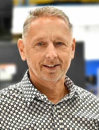 Porträt des Geschäftsführers von weba Werkzeugbau, aufgenommen auf einer Glasstiege. Er steht souverän und selbstbewusst, mit einem leichten Lächeln, was Führungsstärke und Professionalität ausstrahlt. Die moderne Glasstiege verleiht dem Bild eine elegante und zeitgenössische Atmosphäre, die die fortschrittliche Ausrichtung des Unternehmens unterstreicht.
